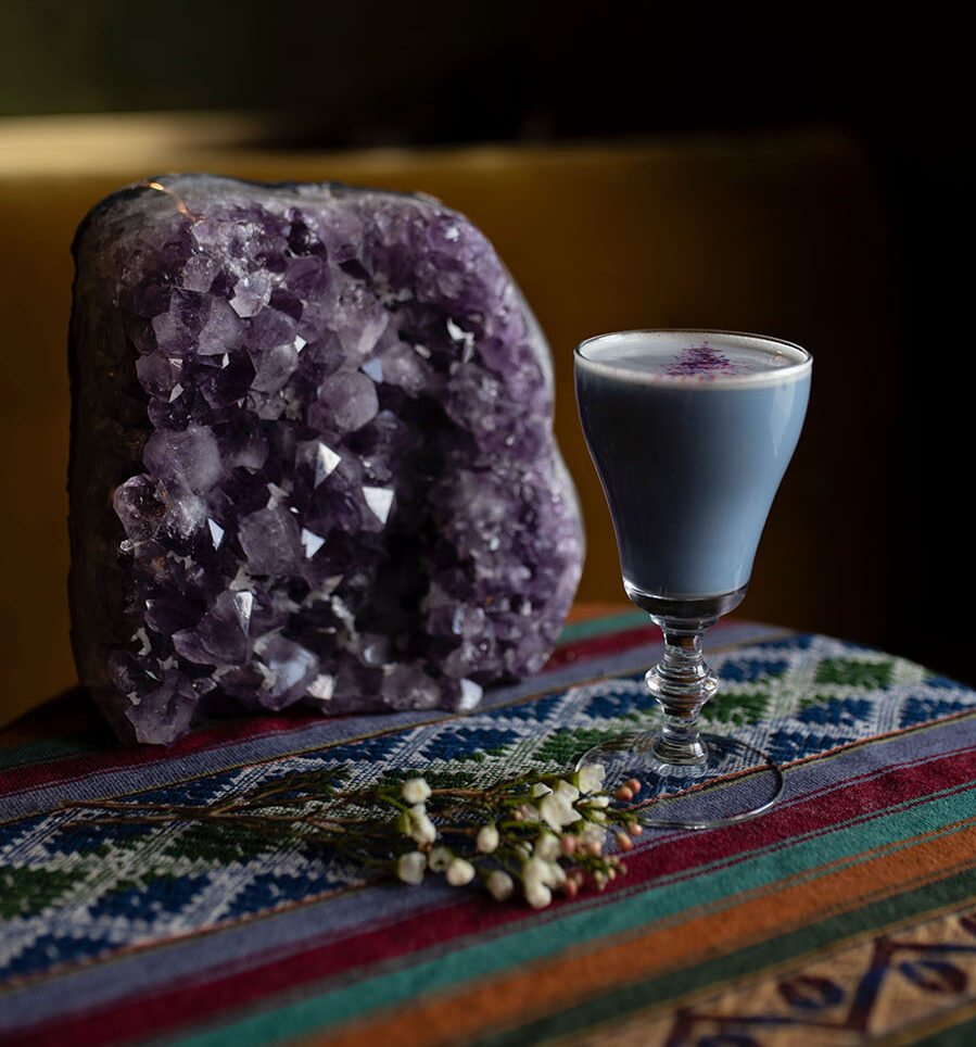 hendrick's blue lotus gin, rothman creme de violette, leopold bros absinthe, mugwort + lavender + blackberry honey, lime, cocktail foam, blue edible glitter